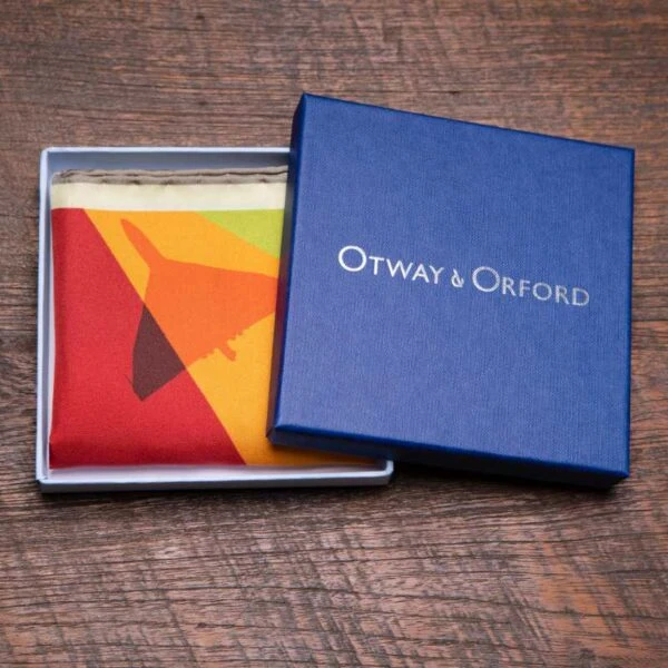 David’s geometric shapes, bold colours, authentic detail and Boy’s Own bravado bring aviation and modern art together. The pocket squares are a celebration of flight. ‘A Beautiful Jigsaw’ is reproduced with a good balance of colour between the printed and reverse side of the silk pocket square. Which works perfectly with any pocket square fold. The artwork is framed by the pocket square’s pale yellow border and grey hand-finished hem. ‘A Beautiful Jigsaw’ makes an ideal gift for men who are thrilled by the jet age and the role that the Vulcan played. Inside the high-quality Otway & Orford branded gift box the pocket square has been carefully wrapped in tissue and is accompanied by a card telling the story of the artist and his artwork.