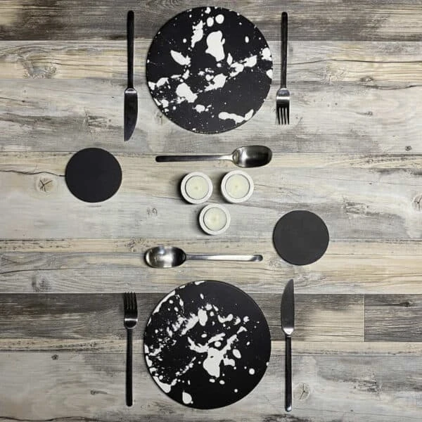 The Concrete & Wax handmade black and white splatter concrete placemats are a striking addition to any monochrome-loving home. As no two splatter designs will ever be identical, each pair of placemats offer the ultimate original aesthetic in luxury tablescaping. Each placemat sits atop a hand-cut 5mm deep cork ring to provide protection and stability no matter what surface of tabletop it rests upon. Sold as a pair, the placemats are delivered beautifully packaged in a branded 2-piece black cardboard box.