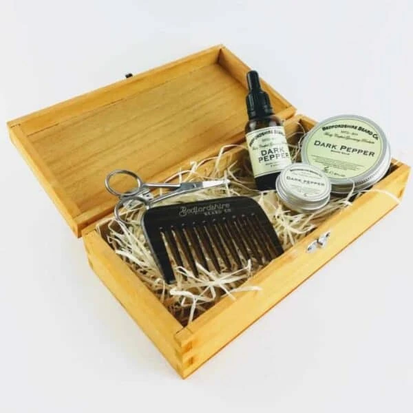 If you have gone to all that trouble of coiffuring the perfect beard or moustache you should treat it with respect and reverence it deserves. The Dark Pepper Beard Set does just that when you need to add a little spice to your life. This elegant scent for the modern gent has hints of patchouli and is warm and earthy. Every Bedfordshire beard care set is handmade in small batches from 100% natural ingredients. It’s what your beard would ask for if it could talk.