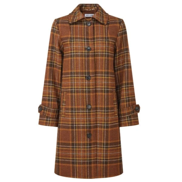 The Denholme Coat in Carnaby Tan is a versatile, single-breasted tartan coat with button cuff details and back pleated vent. Side and inside pockets. Fully lined