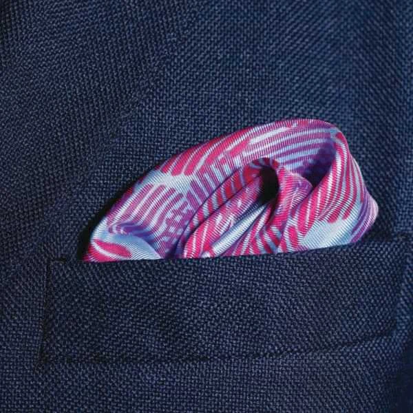 ‘Dot Dash’ is a stylish and unique silk pocket square in blue with mauve and deep pink dots and is finished with a hand-sewn hem. It is a fresh take on a classic archive design.