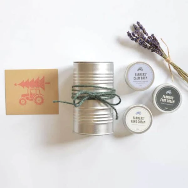 Mini trio of FARMERS’ hand cream, foot cream and calm balm in a silver oil drum tin. Perfect stocking filler for the festive season. Packaged up with a FARMERS’ gift tag.