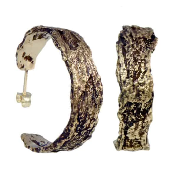 The left and right hoops are cast from different pieces of bark that were chosen for their naturally complementary patterns and shapes. They are slightly different, in other words – a delightful detail that reveals itself on closer inspection.