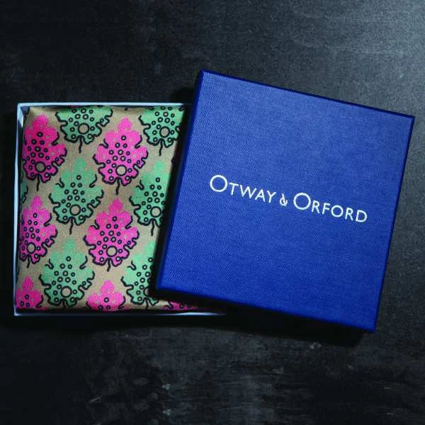 ‘Motif’ is presented in a complimentary Otway & Orford branded gift box with its blueberry-coloured lid and pale blue base. Inside each box, the high-quality silk pocket square comes tissue-wrapped.