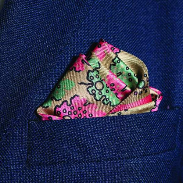 ‘Motif’ is a stylish and unique silk pocket square in camel with green & pink leaf pattern and is finished with a hand-sewn hem. It is a fresh take on a classic archive design.