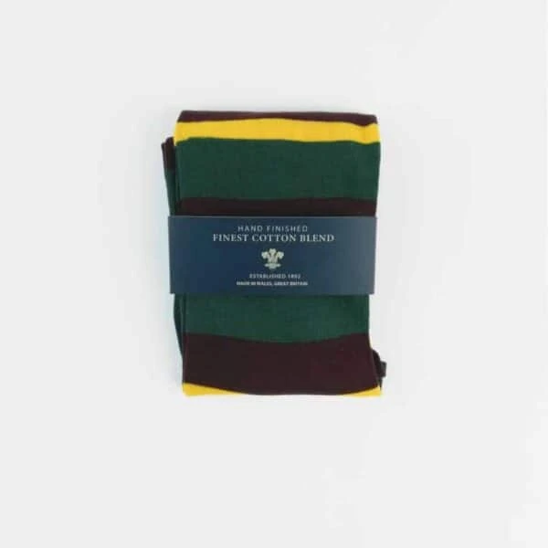Fine gauge cotton Royal Dragoon Guard socks with hand-linked toes designed for a snug fit. Stripe socks made in the colours of Royal Dragoon Guards and commissioned by HRH The Prince of Wales. The Royal Dragoon Guards are a cavalry regiment who count Robert Bayden-Powel as a former officer. He was obviously better know as the founder of the boy scouts. A percentage of the profits from the sale of each pair of stripe socks goes to the Combat Stress charity. Which help former servicemen and women overcome trauma, anxiety and depression. Look good on parade.