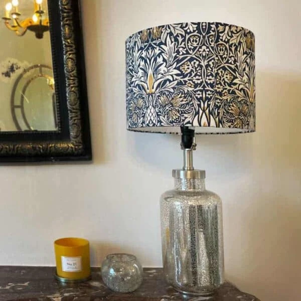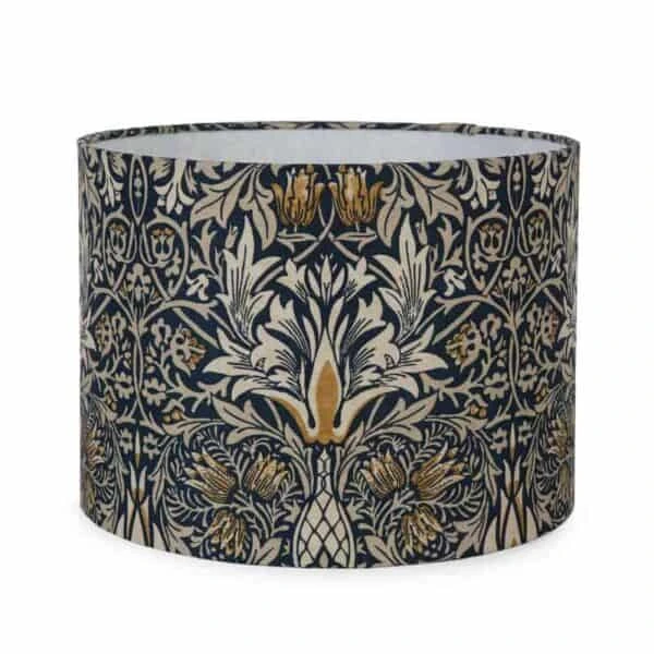 The Green & Heath Snakeshead Cotton Lampshade 30cm is a beautiful drum lampshade designed to light up any interior, either as a table light or a bold overhead feature. Handmade, the pattern is printed on to pure cotton complete with a fireproof PVC coating and perfectly wrapped for a fine finish. Snakeshead was designed by William Morris in 1876, taking its name from the flowers dotted amongst its intricate textile pattern. The cleverly drawn shapes create a captivating three-dimensional effect as if the plants are blossoming from the cotton fabric. This shade will transform any light into the envy of all your guests, be they Sirs or Ladies.
