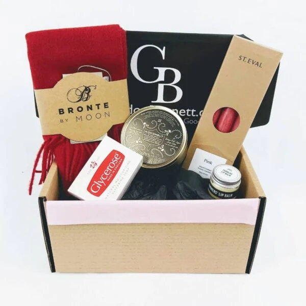 So what have we put in the Valentine’s Gift Box. Firstly, a Scarlet Red scarf, handcrafted in one of the last vertical mills left in Britain. Roses are a must on Valentines day so we have put in a bar of Droyts’ Glycerose soap, beautifully scented of roses. Gold always goes down well on Valentine’s day, so we have also added a tin of Kokomelt 23ct Gold Flake Sugar Scrubs that will make their skin soft after use. A set of six pink St Eval dinner candles, hand poured in Cornwall, perfect for setting the mood for the evening ahead. And a Farmers’ Lip Balm for in the morning after both of your lips that have taken a lot of use through the night.