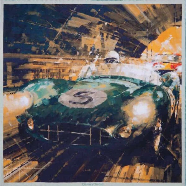 ‘Victory At Last’ is inspired by classic motor racing and is a high quality medium sized Aston Martin silk pocket square with hand-rolled and hand-sewn hem. It is made in Macclesfield the traditional home of English silk printing and presented in a complimentary gift box. It was created in collaboration with leading ‘painter of speed’ John Ketchell whose original acrylic on canvas work was inspired by the famous moment in motorsport history when Aston Martin won Le Mans outright in 1959. In the race, the DBR1 of Roy Salvadori and Carroll Shelby finally achieved victory for Aston Martin which had entered every Le Mans since 1931. John’s semi-abstract impressionist style captures speed and drama at the same time as delivering accuracy of reproduction. The subject seems to burst into life.