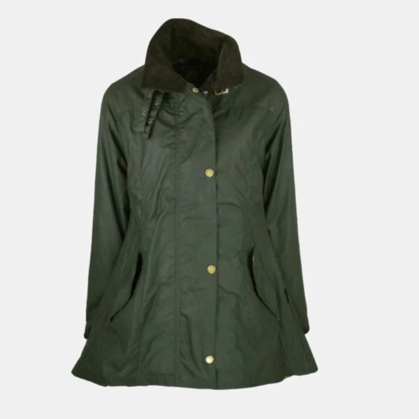 The Oxford Blue Olivia women’s wax Jacket in green is made from 100% Waxed cotton lined with a plaid 100% cotton lining. This stylish wax jacket sports a longer rear tail, detachable hood, inside zipper pocket and adjustable bands to the rear, in order to giver a fitted look.